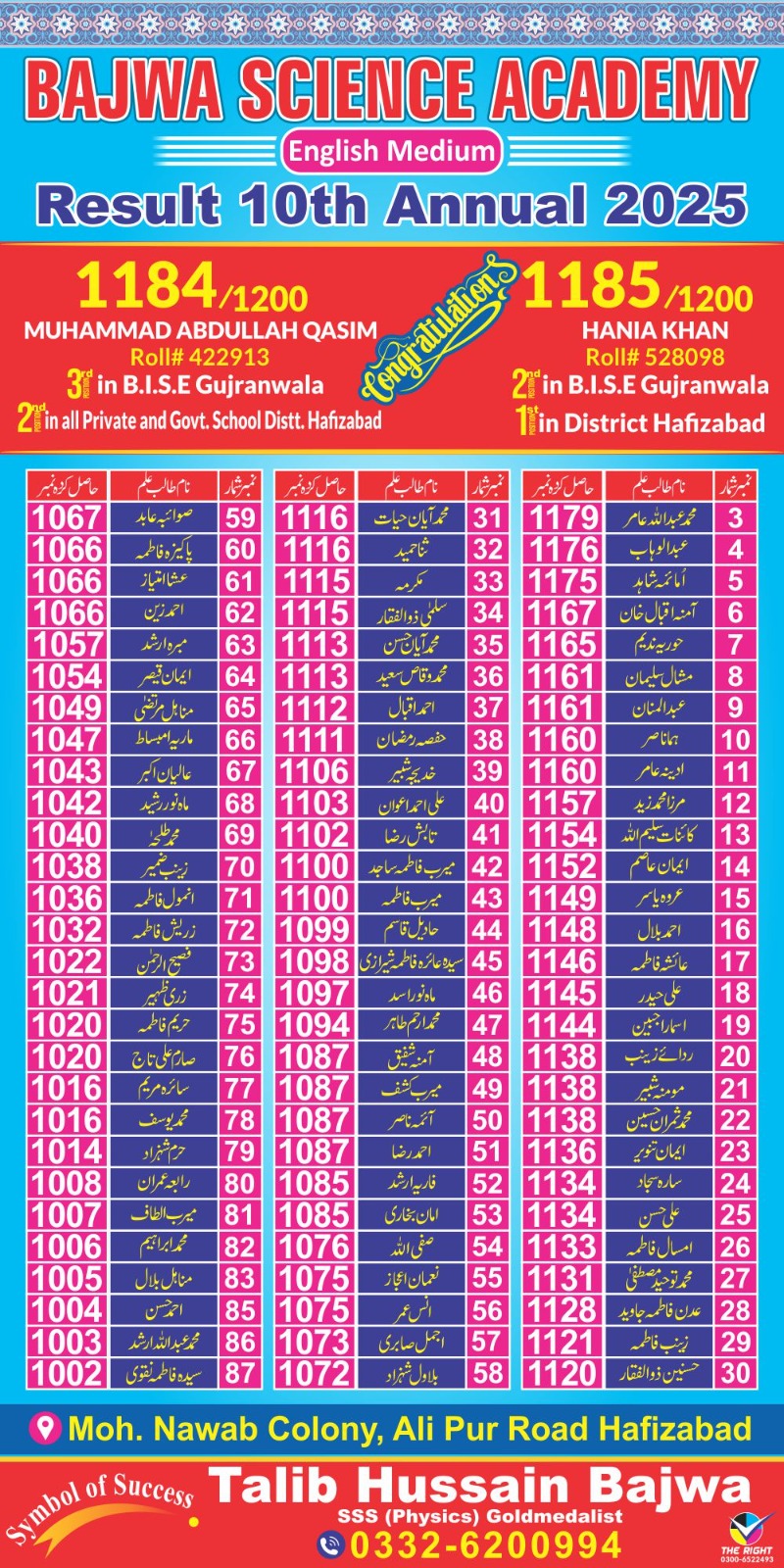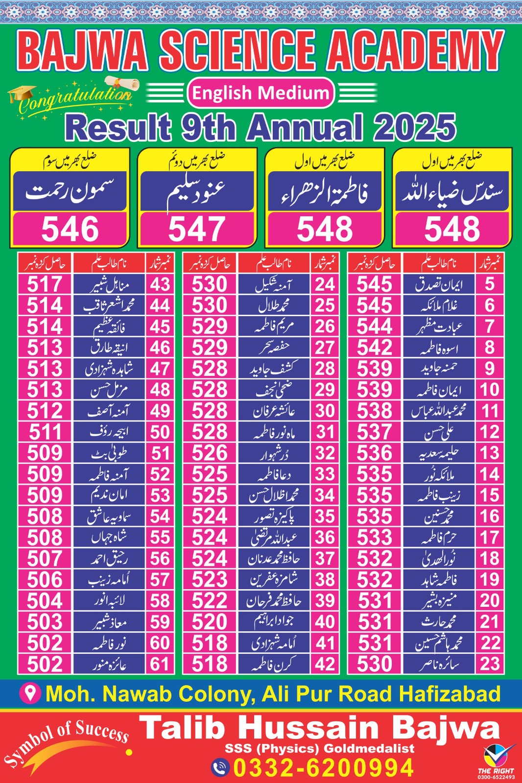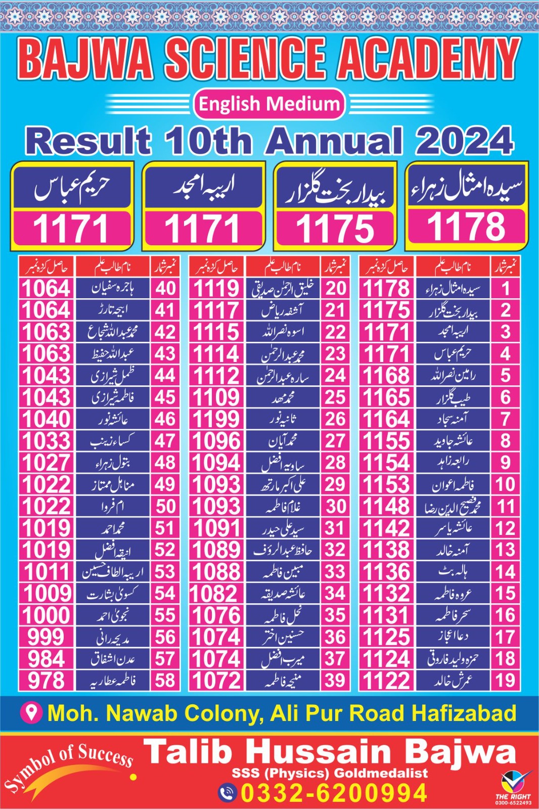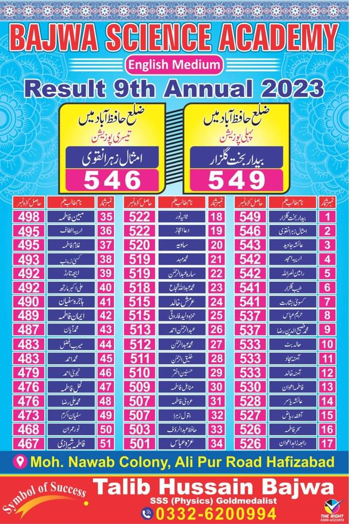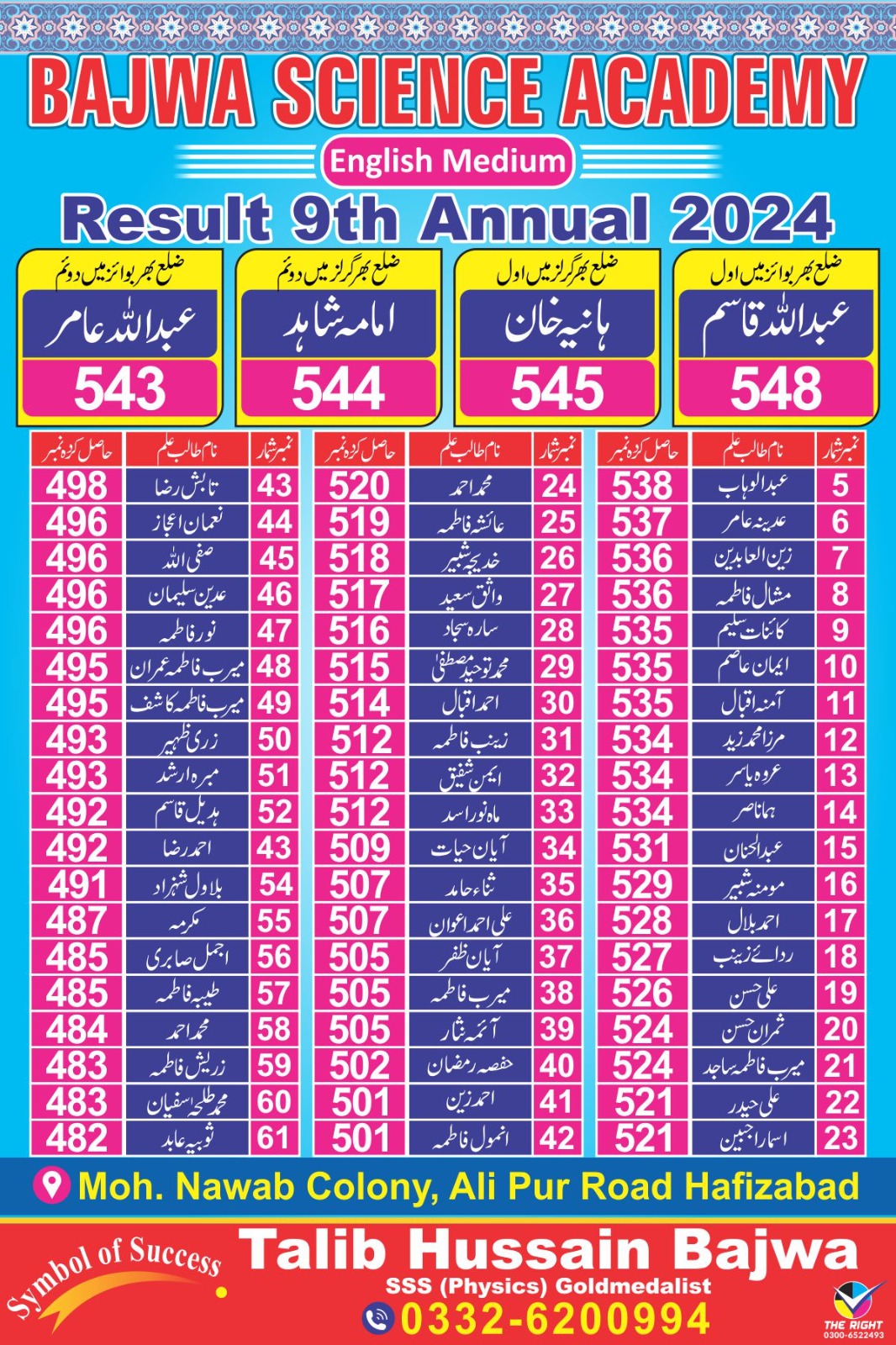 It is with great pride and enthusiasm that I welcome you to BAJWA SCIENCE ACADEMY AND SCHOOL HAFIZABAD. As the Principal, my mission is to foster a nurturing and dynamic learning environment where every student can thrive academically, socially, and emotionally. At BAJWA SCIENCE ACADEMY AND SCHOOL Hafizabad, we believe in the power of education to transform lives. Our dedicated teachers and staff are committed to providing a holistic education that combines academic excellence with character development, creativity, and critical thinking. We encourage students to embrace challenges, cultivate resilience, and become lifelong learners. To our parents and guardians: your partnership is invaluable. Together, we can ensure that our students reach their fullest potential. I invite you to actively engage in school activities and maintain open communication with us. Let us continue to uphold the values of respect, integrity, and perseverance as we work toward a brighter future for all.